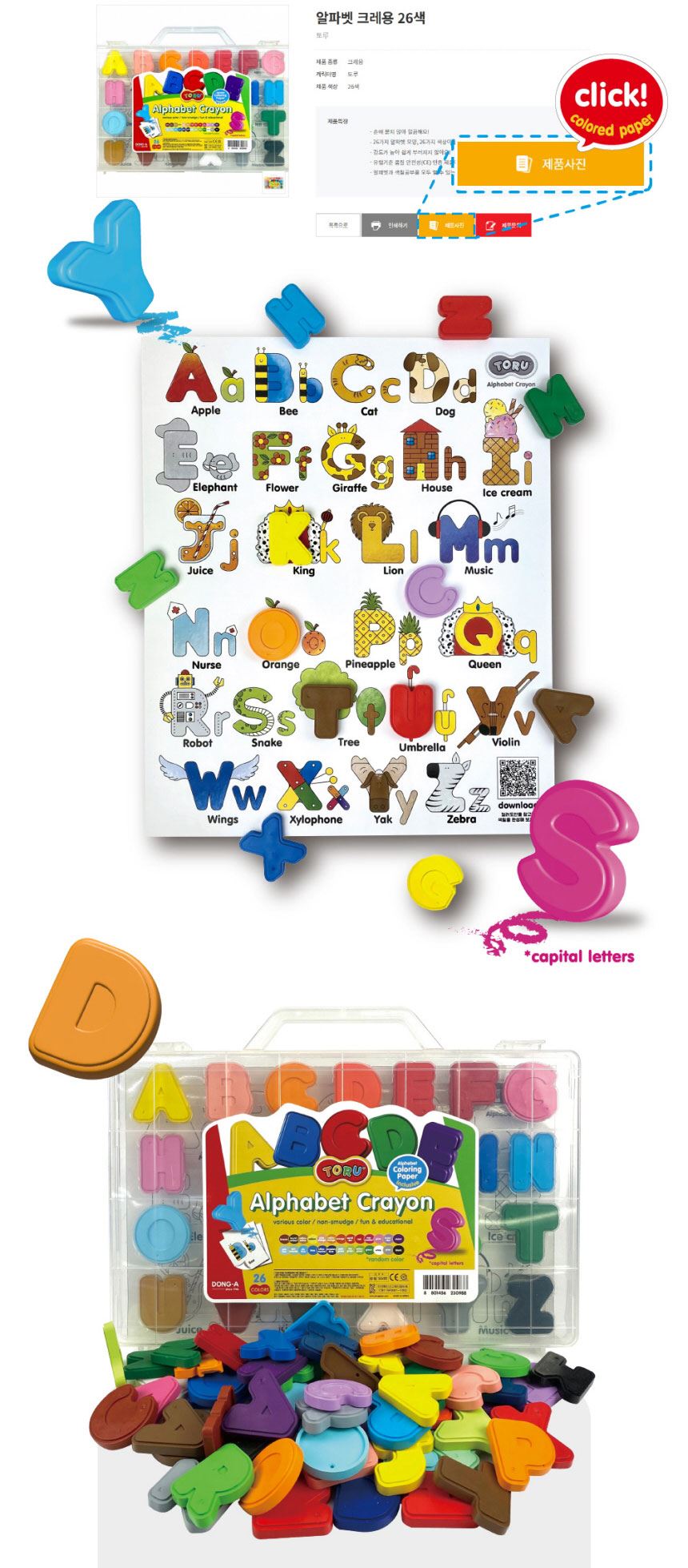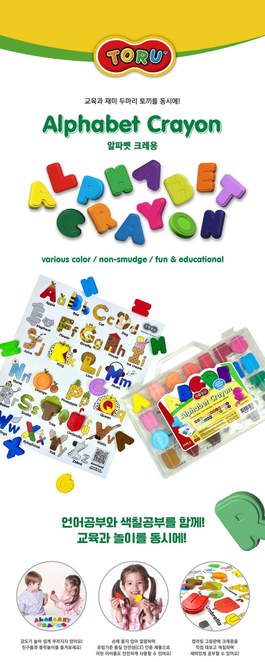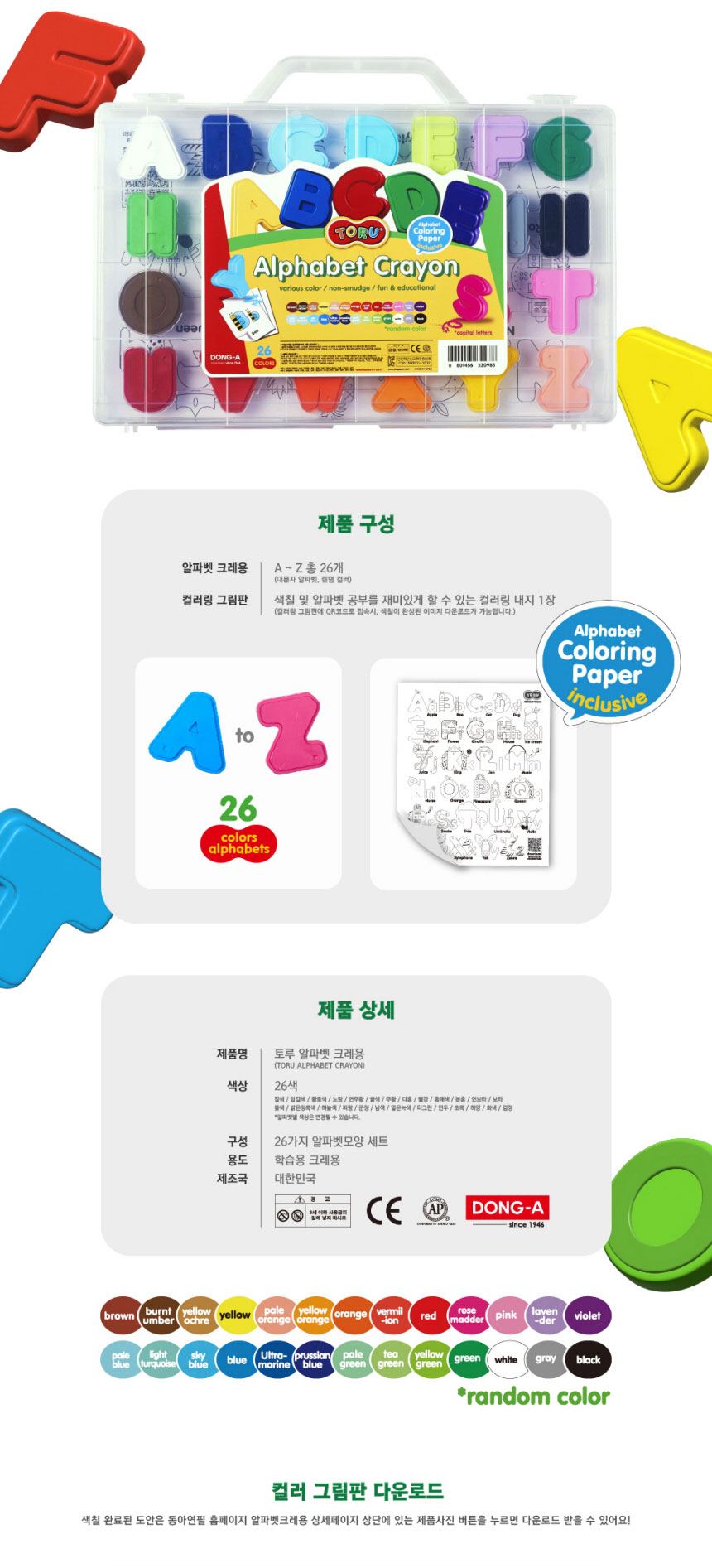 동아연필 유아 어린이 미술 손에 묻지않는 토루 알파벳 크레용 26색 / 설래임 / 디비디비 / 구매하기 / 특가할인