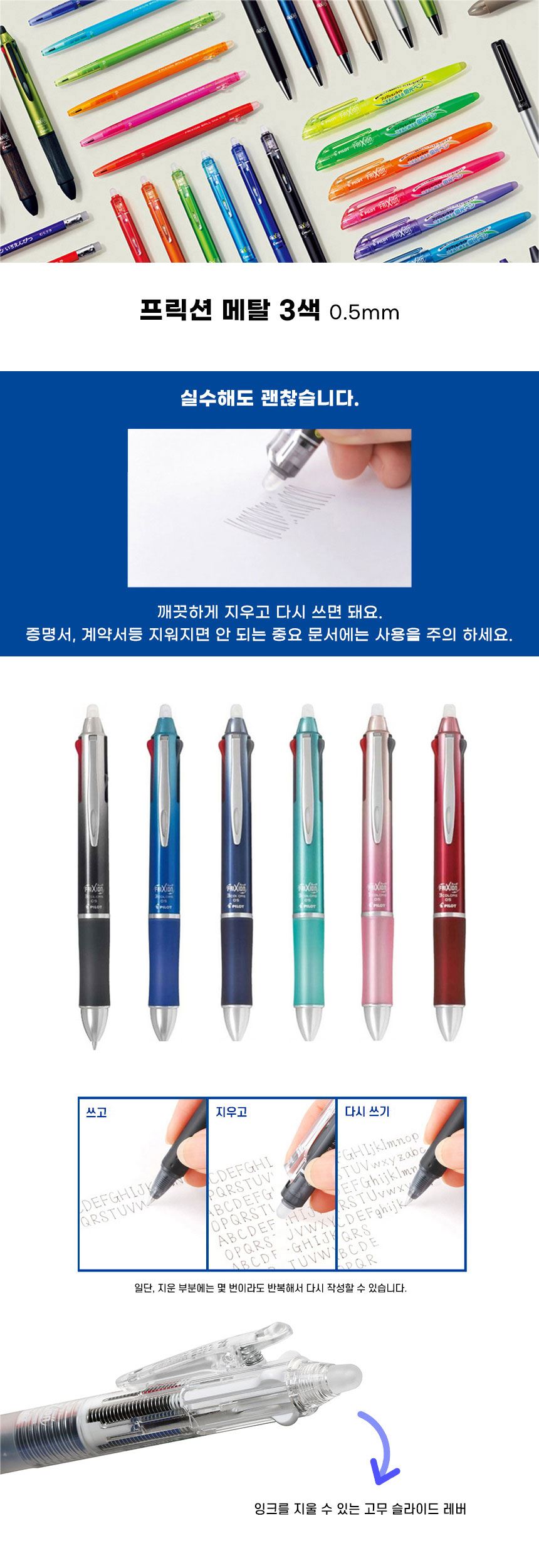 파이롯트 다색펜 프릭션 메탈 3색 지워지는 볼펜 0.5mm