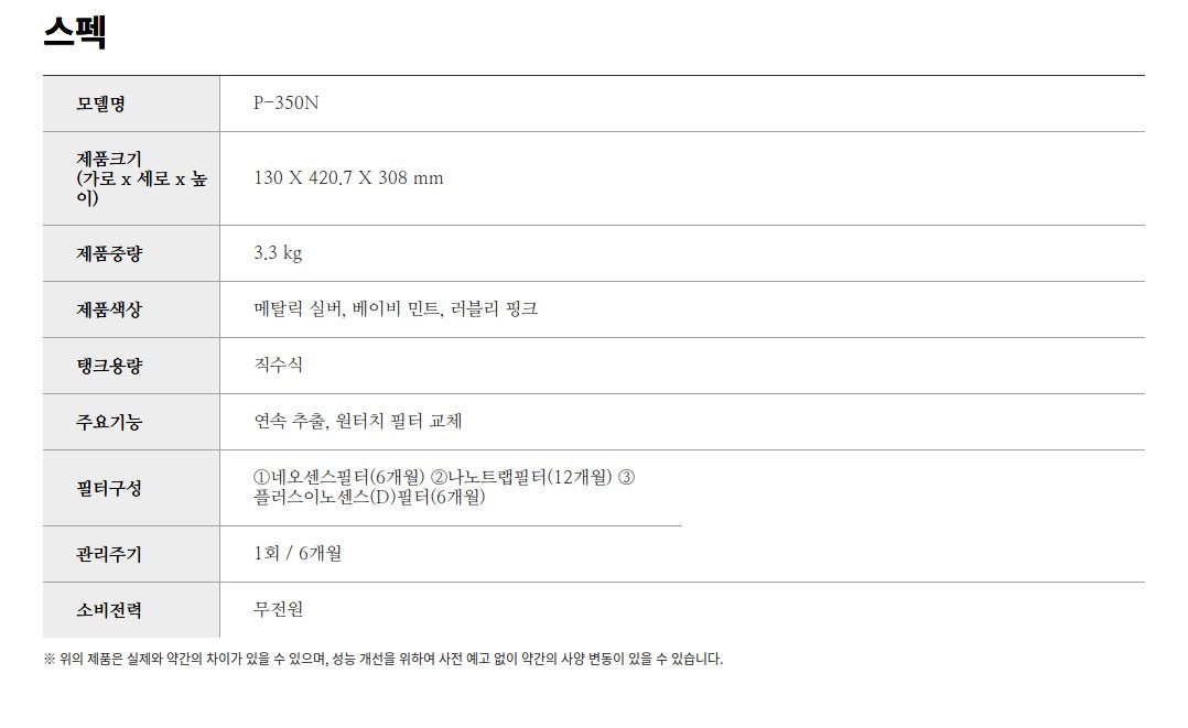 • P-350N 코웨이 무전원 직수형 정수기 / 정수전용(온수X,냉수X) / 월 19,900원 / 6개월관리