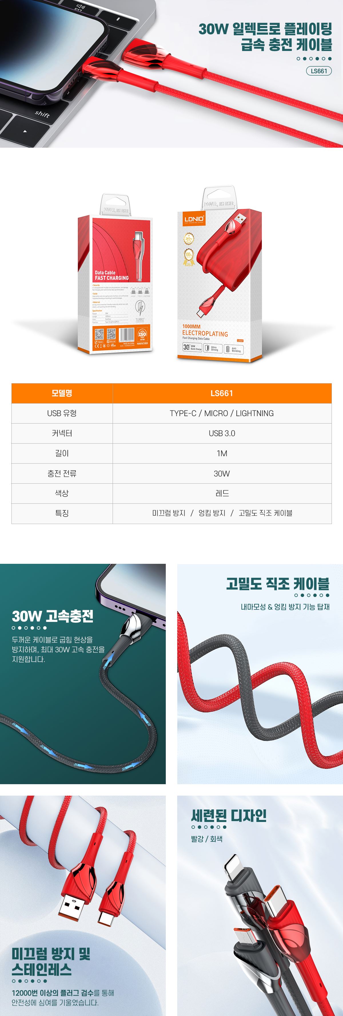 품명 및 모델명 엘디니오 30W 일렉트로 플레이팅 충전케이블 1M 8핀 레드