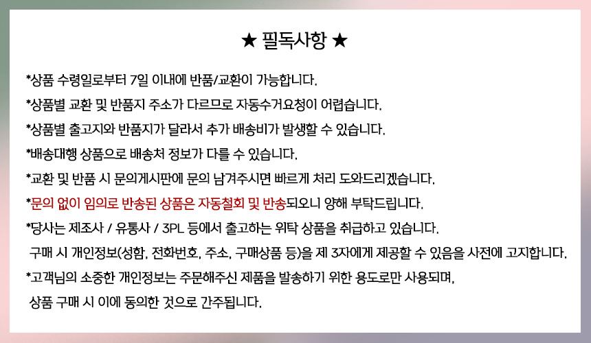 ㆍ 무료배송 상품이라도 반품 시 최초 배송료를 포함한 왕복 배송비가 부과될 수 있습니다.