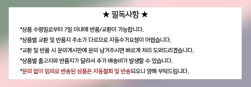 ㆍ 무료배송 상품이라도 반품 시 최초 배송료를 포함한 왕복 배송비가 부과될 수 있습니다.