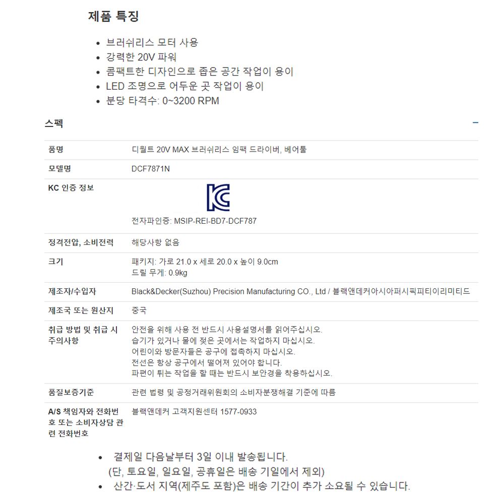 • 디월트 임팩 드라이버 드릴 전동드릴 충전 무선 가정용드릴 공구 20V 브러쉬리스 베어툴 DCF7871N