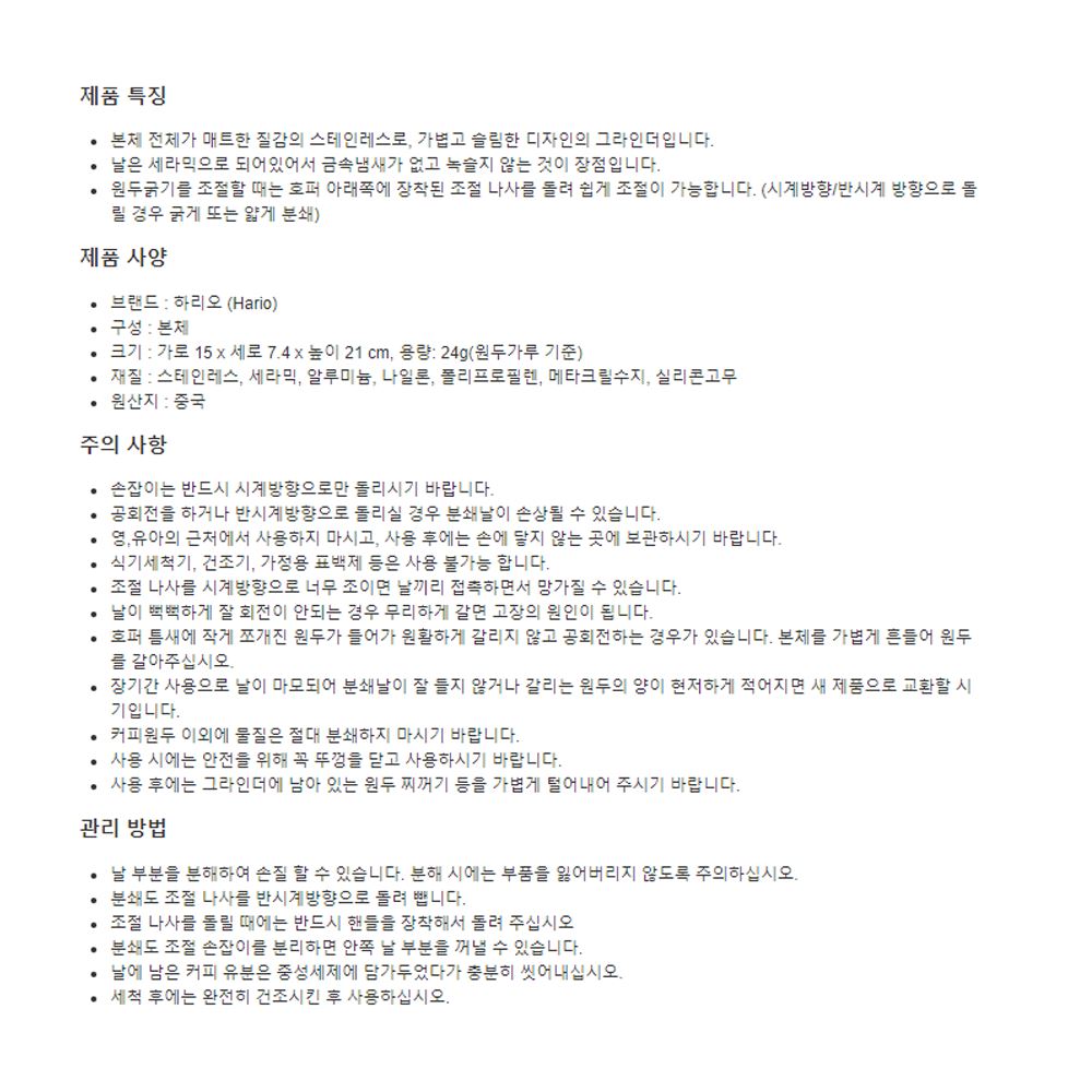 • 하리오 커피 분쇄기 원두 그라인더 핸드밀 가정용 수동 커피밀 원두가는기계 세라믹 프로