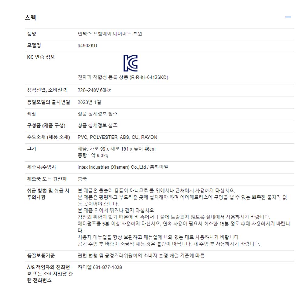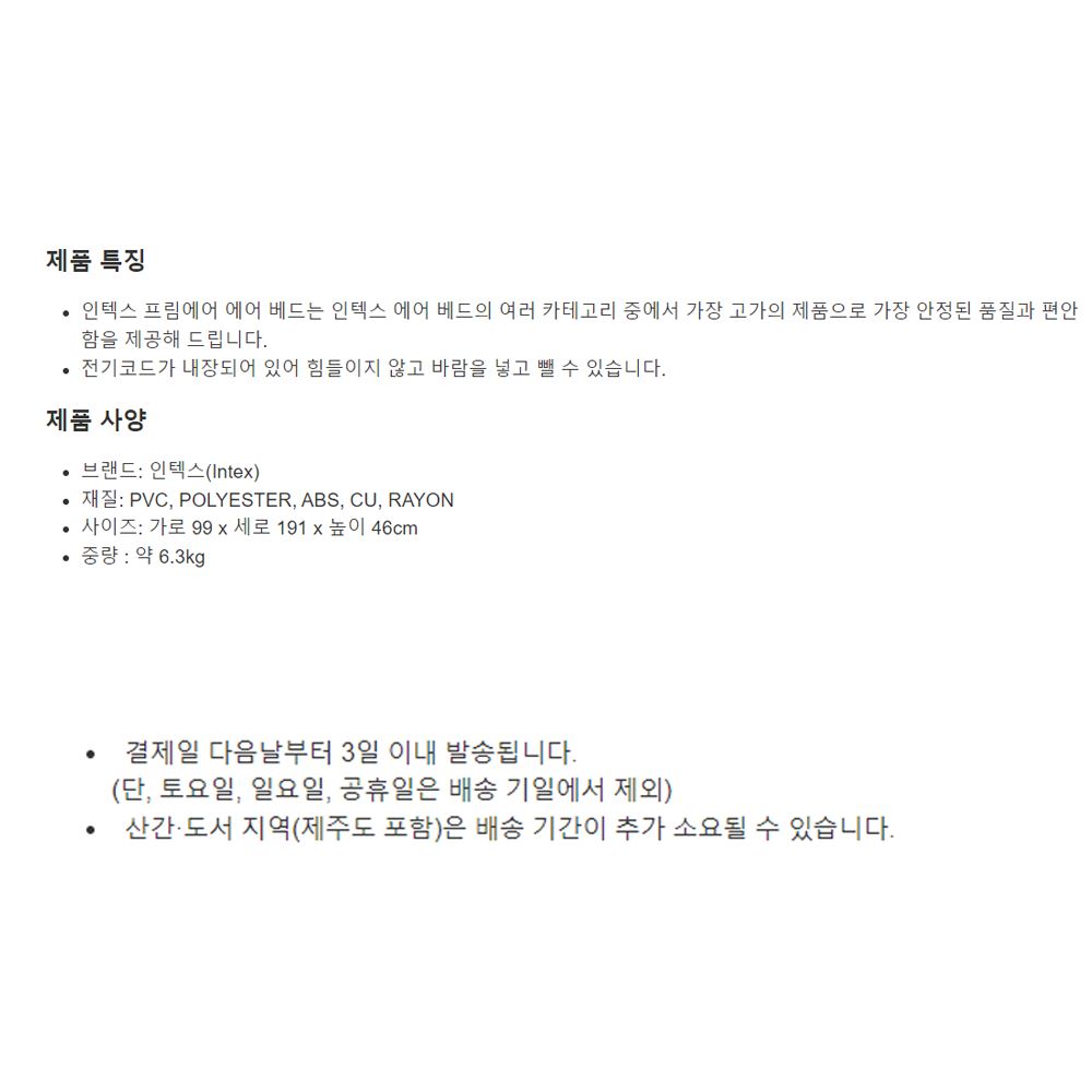 • 인텍스 캠핑 에어매트 1인용 싱글 두꺼운 매트리스 자충 텐트 차박 에어 침대 베드 매트 프림에어 에어베드 트윈 intex 64902KD 추천