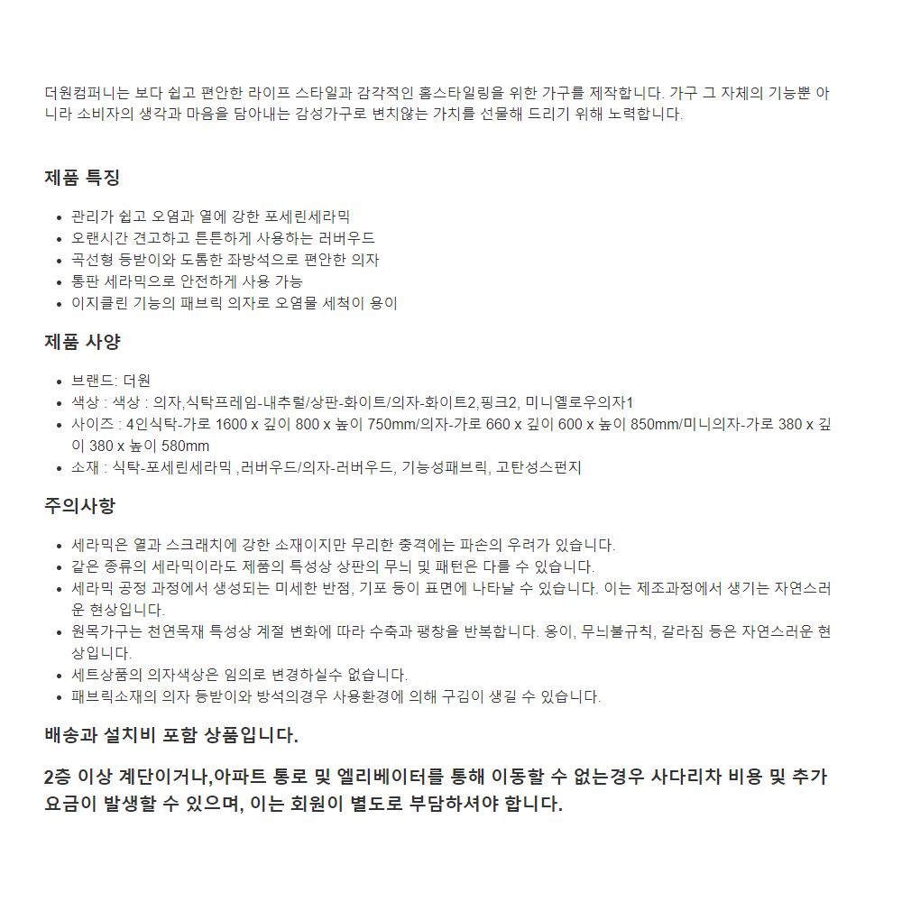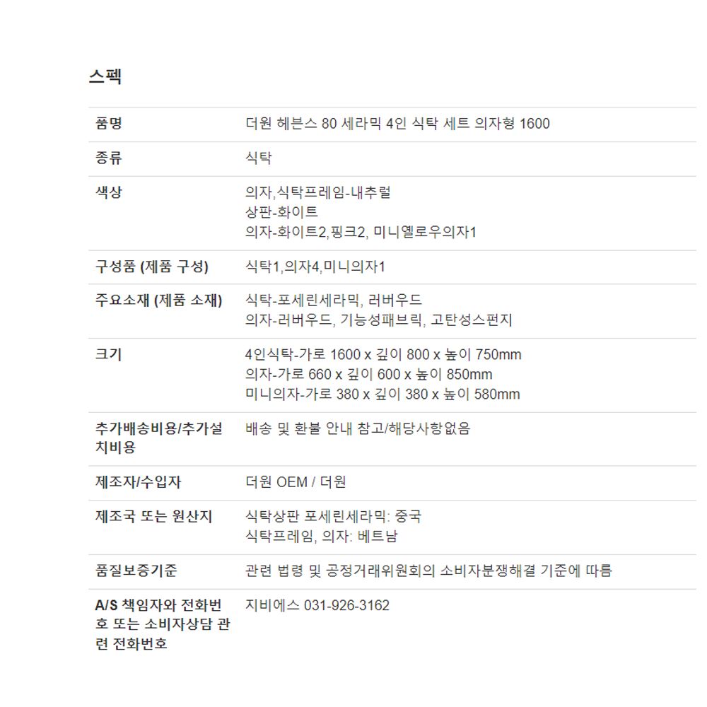 사이즈 : 4인식탁-가로 1600 x 깊이 800 x 높이 750mm/의자-가로 660 x 깊이 600 x 높이 850mm/미니의자-가로 380 x 깊이 380 x 높이 580mm