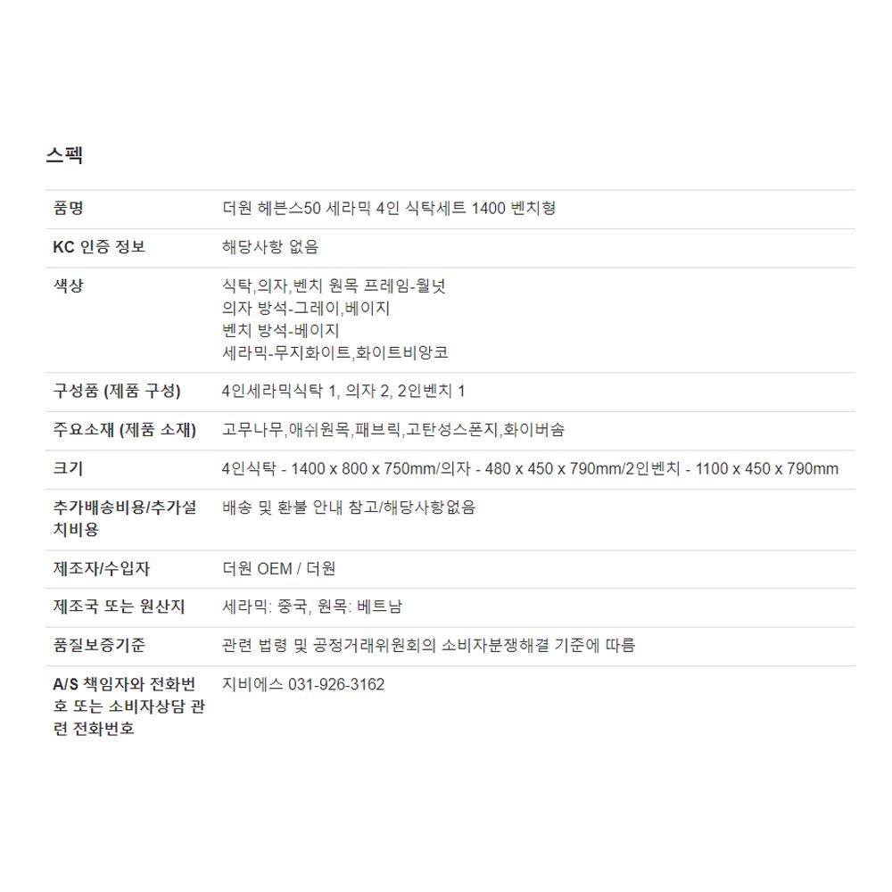 더원 4인용 포세린 세라믹식탁 세트 원목 식탁 사각 테이블 패브릭 의자 벤치형 1400 / 다모아아토즈님의 스토어 / 디비디비 / 구매하기 / 특가할인