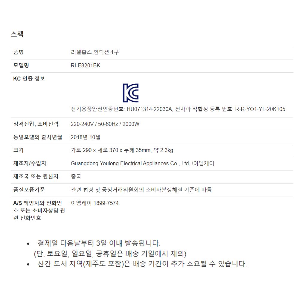 • 러셀홉스 1구 인덕션 전기레인지 미니 휴대용 캠핑용 가정용 소형인덕션 전기렌지 버너 랜지 RI-E8201BK 추천