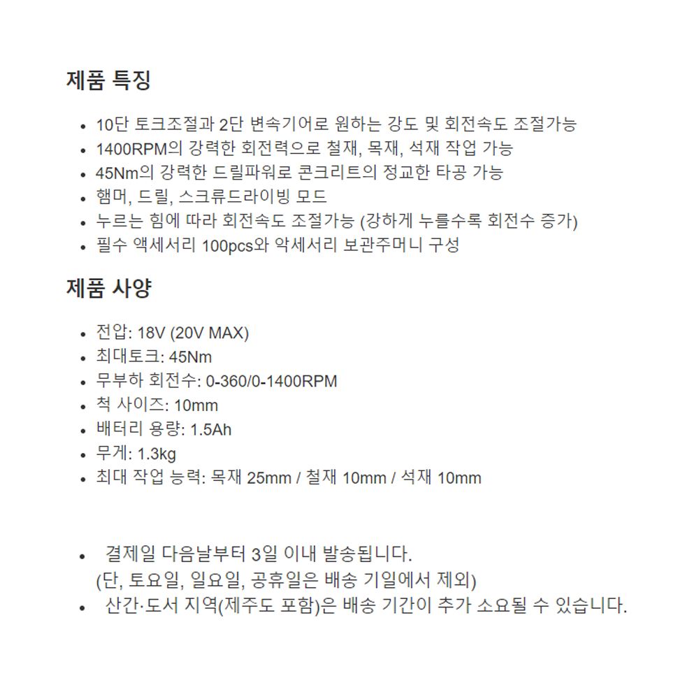 철재용 드릴비트 9개, 콘크리트용 드릴비티 4개, 비트 홀더 1개, 드라이버 비트 22개, 나사 30개,