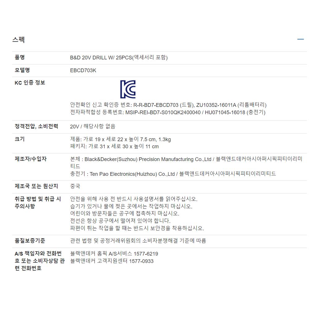 • 블랙앤데커 무선 전동 드릴세트 20V 충전 드라이버 드릴 스크류 드라이빙 액세서리 25p EBCD703K