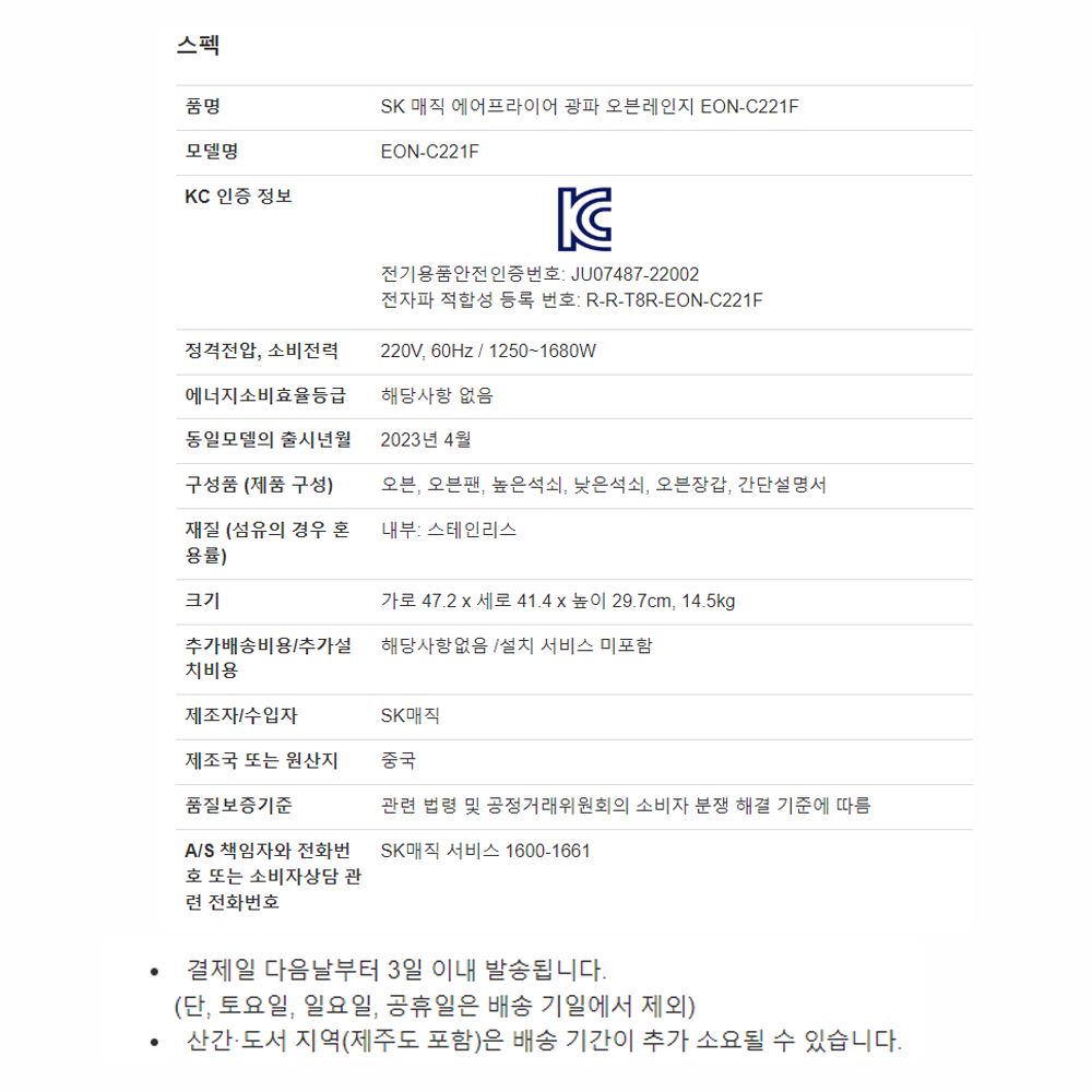 • SK매직 에어프라이어 전기오븐 레인지 광파오븐 23L 가정용 멀티 제과제빵 전자렌지오븐기 EON-C221F 추천