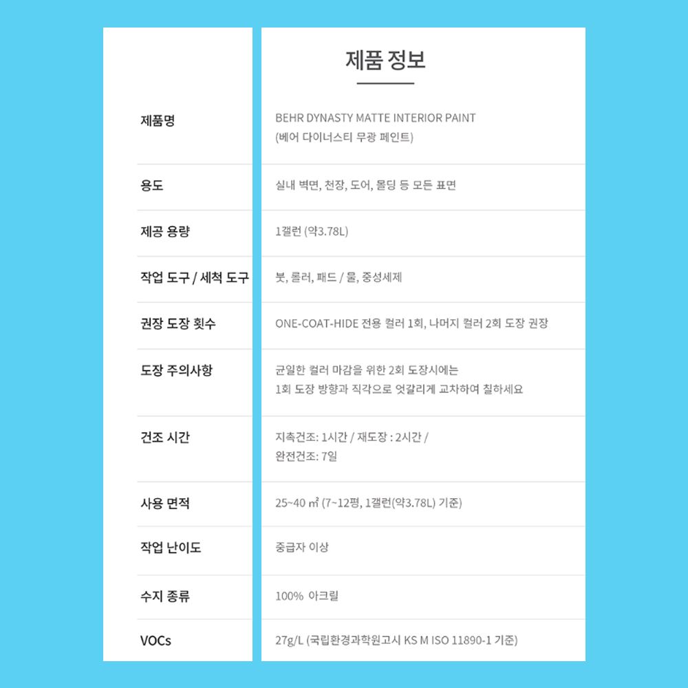 도포 면적: 3.78 리터 (1갤런), 2회칠 기준 약 7~8평(약 25㎡)