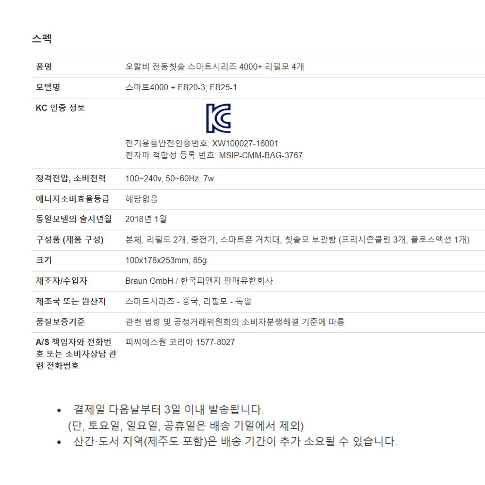 • 오랄비 전동칫솔 진동칫솔 가정용 휴대용 무선 충전식 구강청정기 리필모4개 스마트시리즈 4000 추천