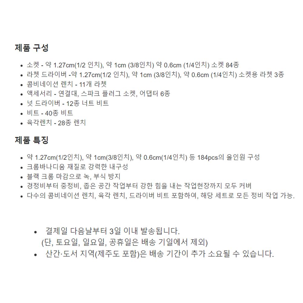 약 1.27cm(1/2인치), 약 1cm(3/8인치), 약 0.6cm(1/4인치) 등 184pcs의 올인원 구성