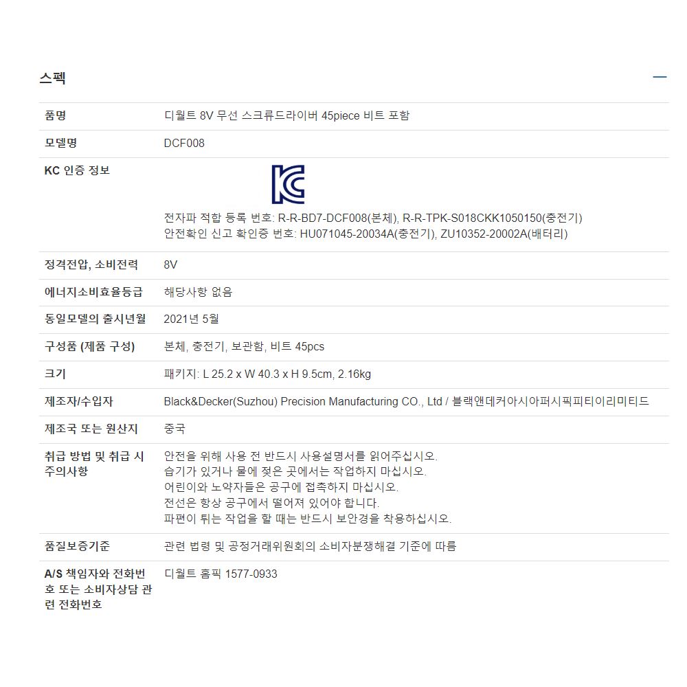 전자파 적합 등록 번호: R-R-BD7-DCF008(본체), R-R-TPK-S018CKK1050150(충전기)