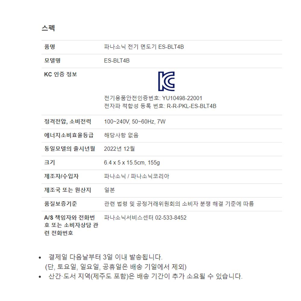 파나소닉 전기면도기 남성용 남자 휴대용 전동 방수 여행용 건식 습식 3중날 면도기 / 다모아아토즈님의 스토어 / 디비디비 / 구매하기 / 특가할인