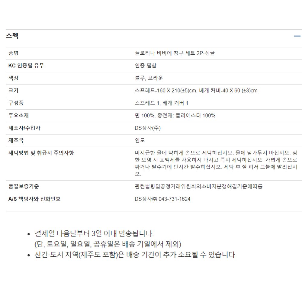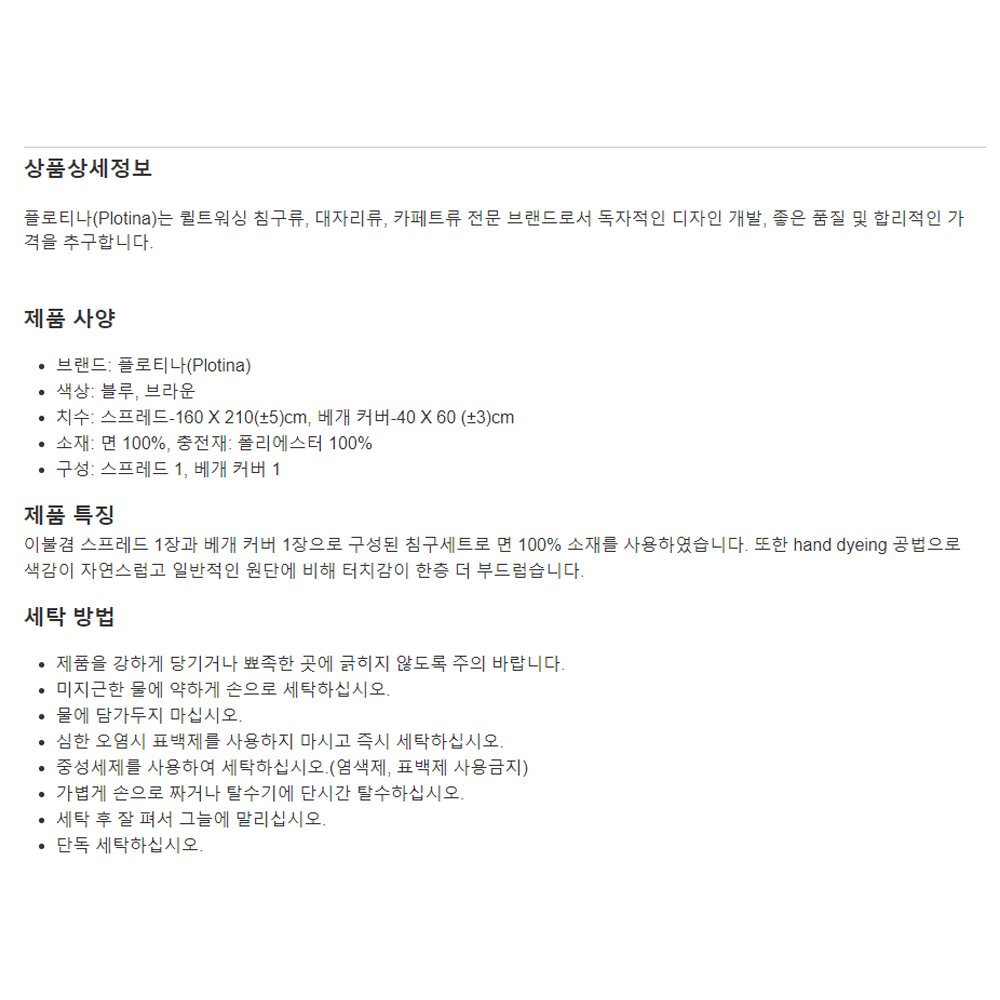 치수: 스프레드-160 X 210(±5)cm, 베개 커버-40 X 60 (±3)cm