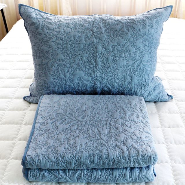 이불겸 스프레드 1장과 베개 커버 1장으로 구성된 침구세트로 면 100% 소재를 사용하였습니다. 또한 hand dyeing 공법으로 색감이 자연스럽고 일반적인 원단에 비해 터치감이 한층 더 부드럽습니다.