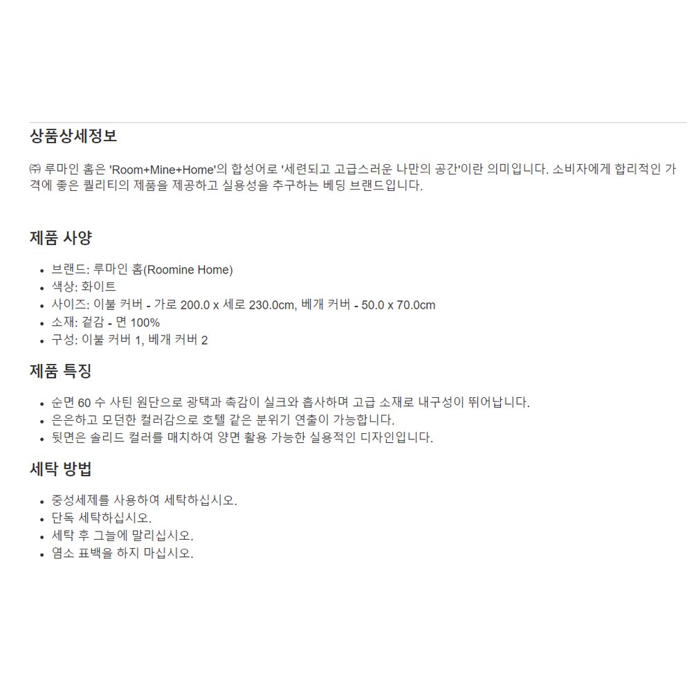 • ㈜ 루마인 홈은 'Room+Mine+Home'의 합성어로 '세련되고 고급스러운 나만의 공간'이란 의미입니다. 소비자에게 합리적인 가격에 좋은 퀄리티의 제품을 제공하고 실용성을 추구하는 베딩 브랜드입니다.