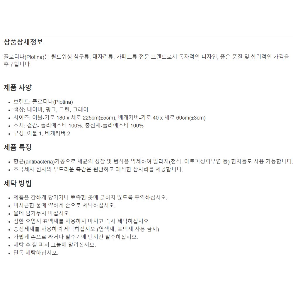 사이즈: 이불-가로 180 x 세로 225cm(±5cm), 베개커버-가로 40 x 세로 60cm(±3cm)