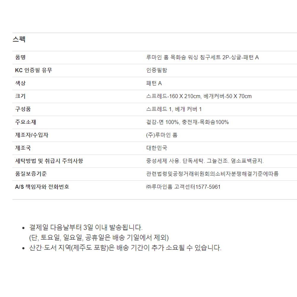• 루마인홈 목화솜워싱침구세트2P 싱글 / S사이즈침구류이불세트 봄여름가을겨울사계절간절기 침대이불베개커버세트셋 1인용손님용면이불 먼지없는이불