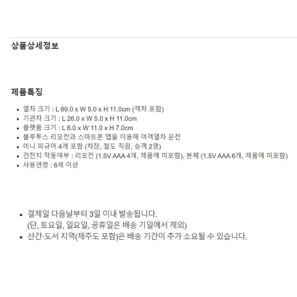 열차 크기 : L 69.0 x W 5.0 x H 11.0cm (객차 포함)