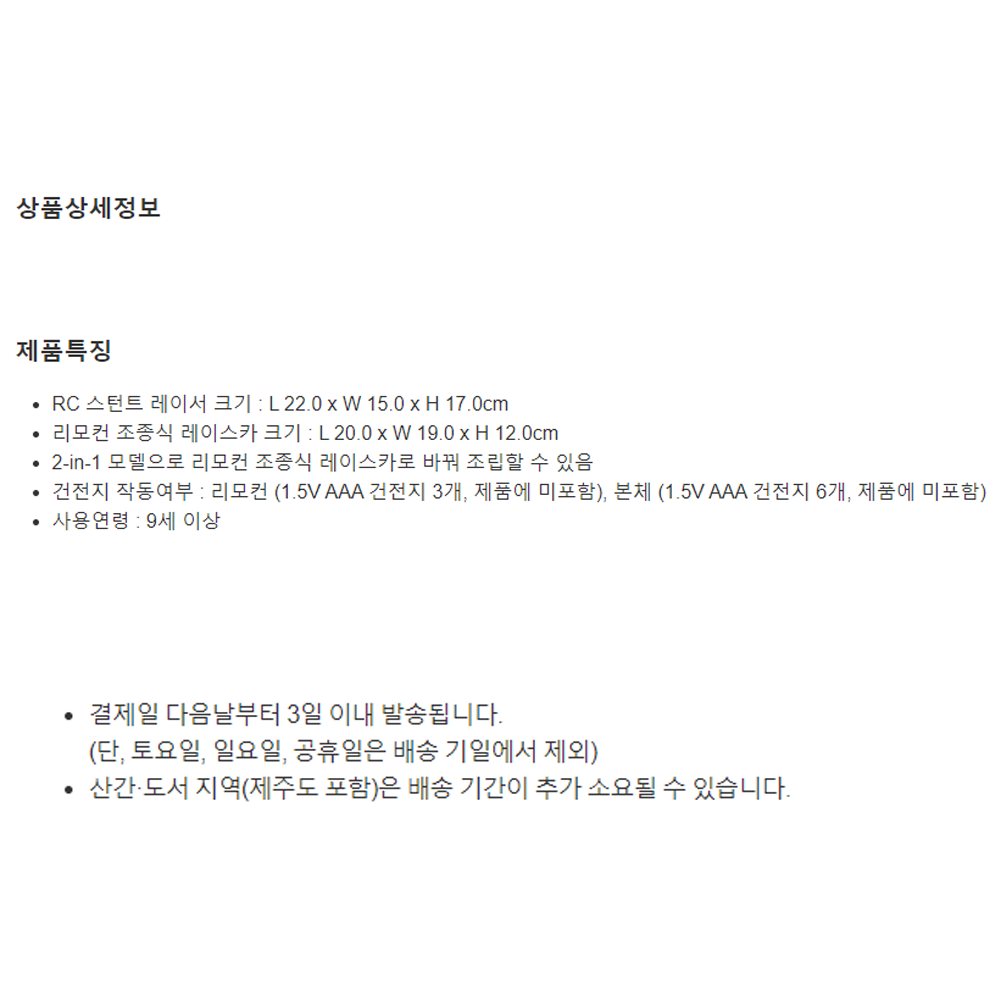 리모컨 조종식 레이스카 크기 : L 20.0 x W 19.0 x H 12.0cm