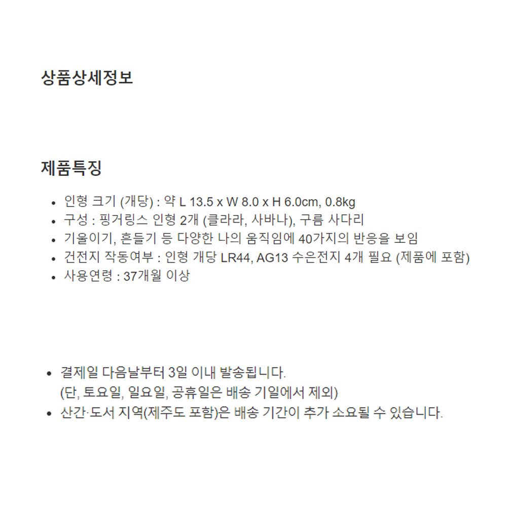 건전지 작동여부 : 인형 개당 LR44, AG13 수은전지 4개 필요 (제품에 포함)