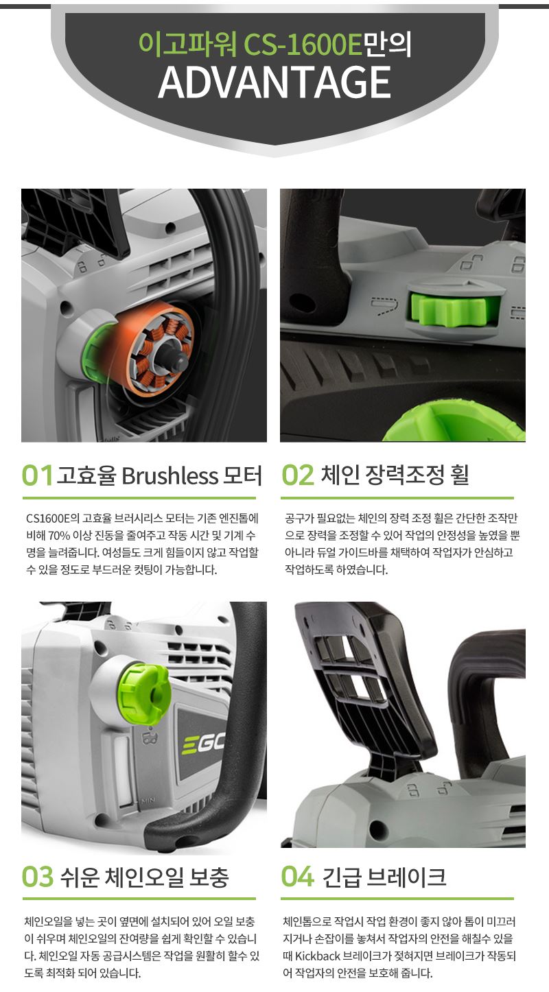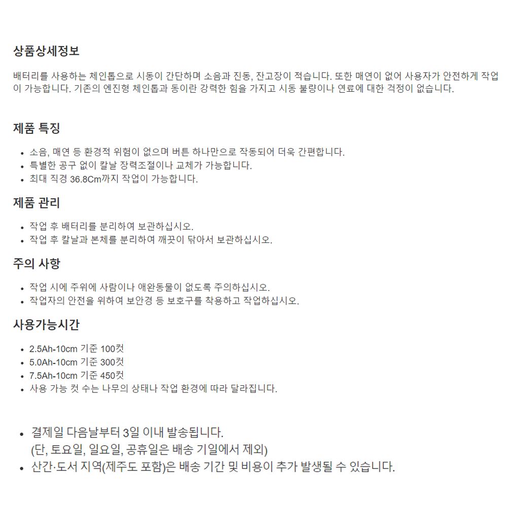 기존의 엔진형 체인톱과 동이란 강력한 힘을 가지고 시동 불량이나 연료에 대한 걱정이 없습니다.