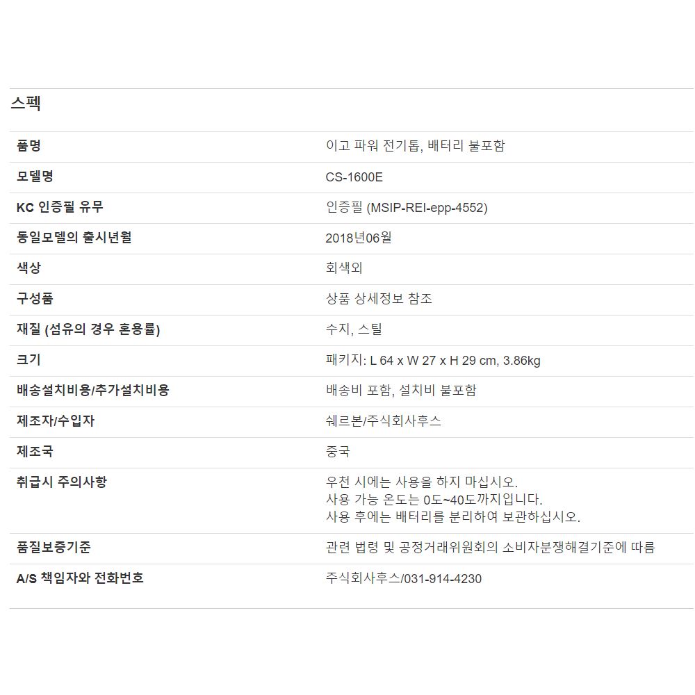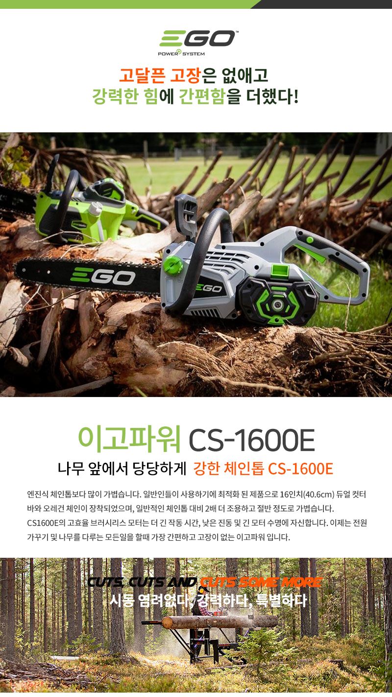 기존의 엔진형 체인톱과 동이란 강력한 힘을 가지고 시동 불량이나 연료에 대한 걱정이 없습니다.