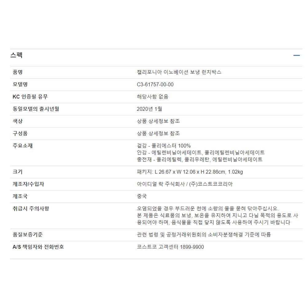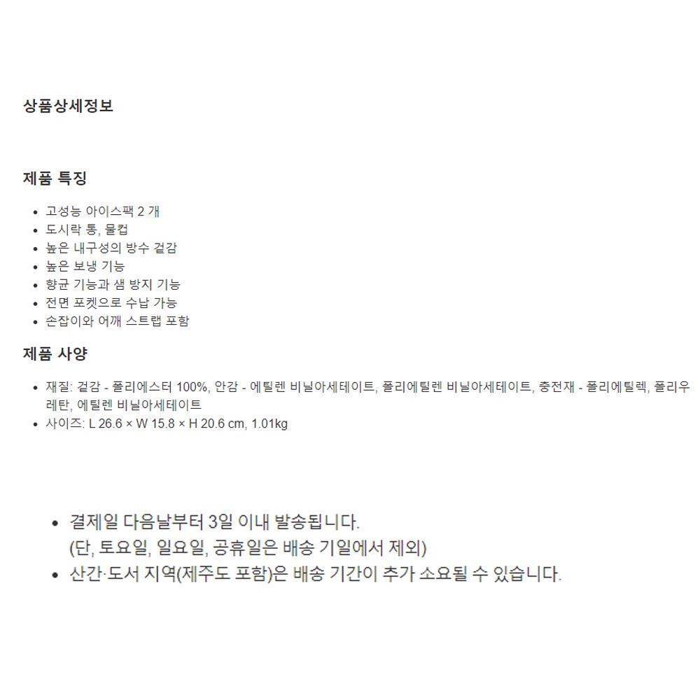 본 제품은 식료품의 보냉, 보온을 유지하여 지니고 다닐 목적의 용도로 사용되어야 하며, 음식물을 직접 닿지 않도록 사용하여 주시기 바랍니다