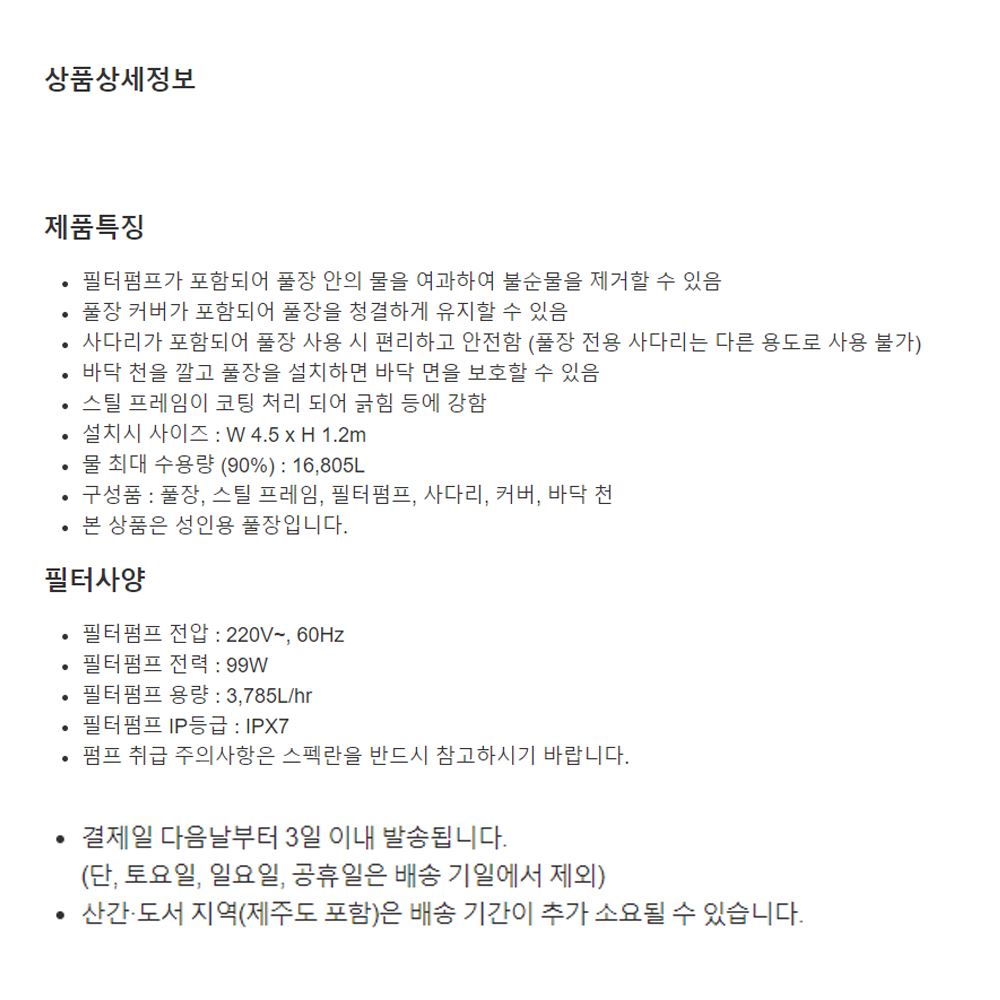 구성품 : 풀장, 스틸 프레임, 필터펌프, 사다리, 커버, 바닥 천