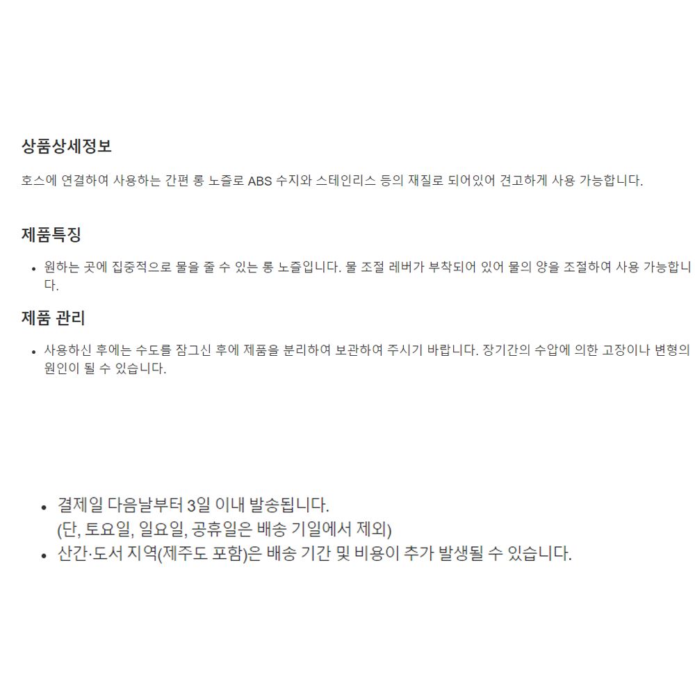 • 호스에 연결하여 사용하는 간편 롱 노즐로 ABS 수지와 스테인리스 등의 재질로 되어있어 견고하게 사용 가능합니다.