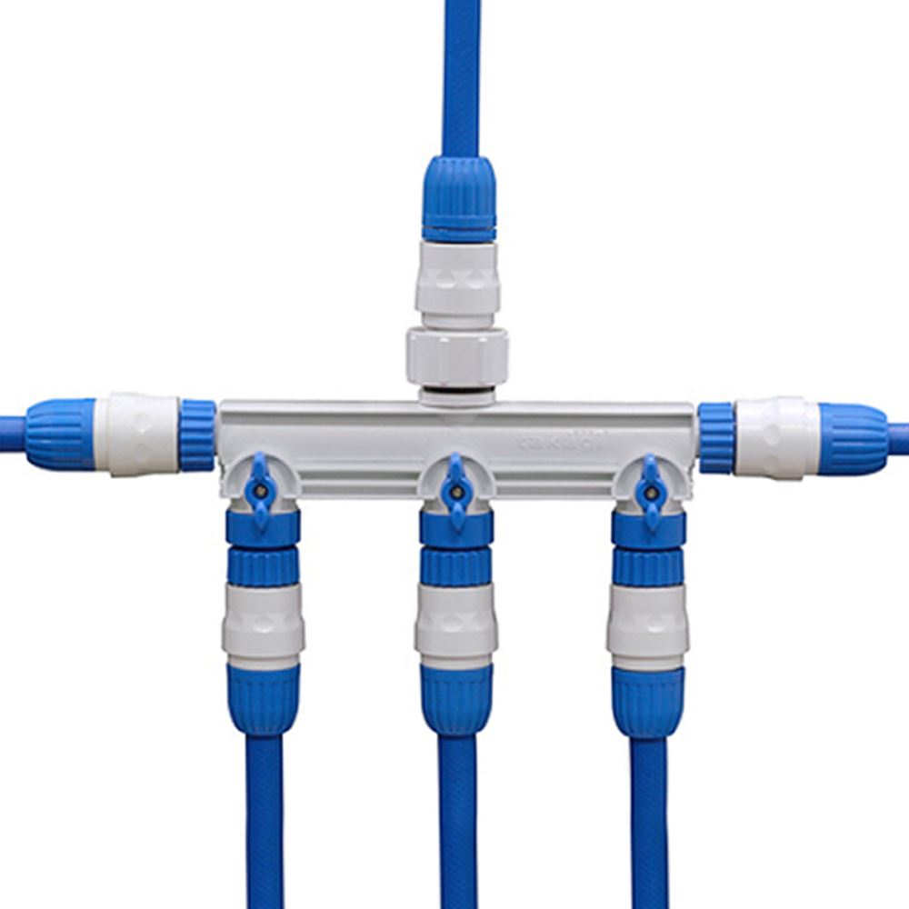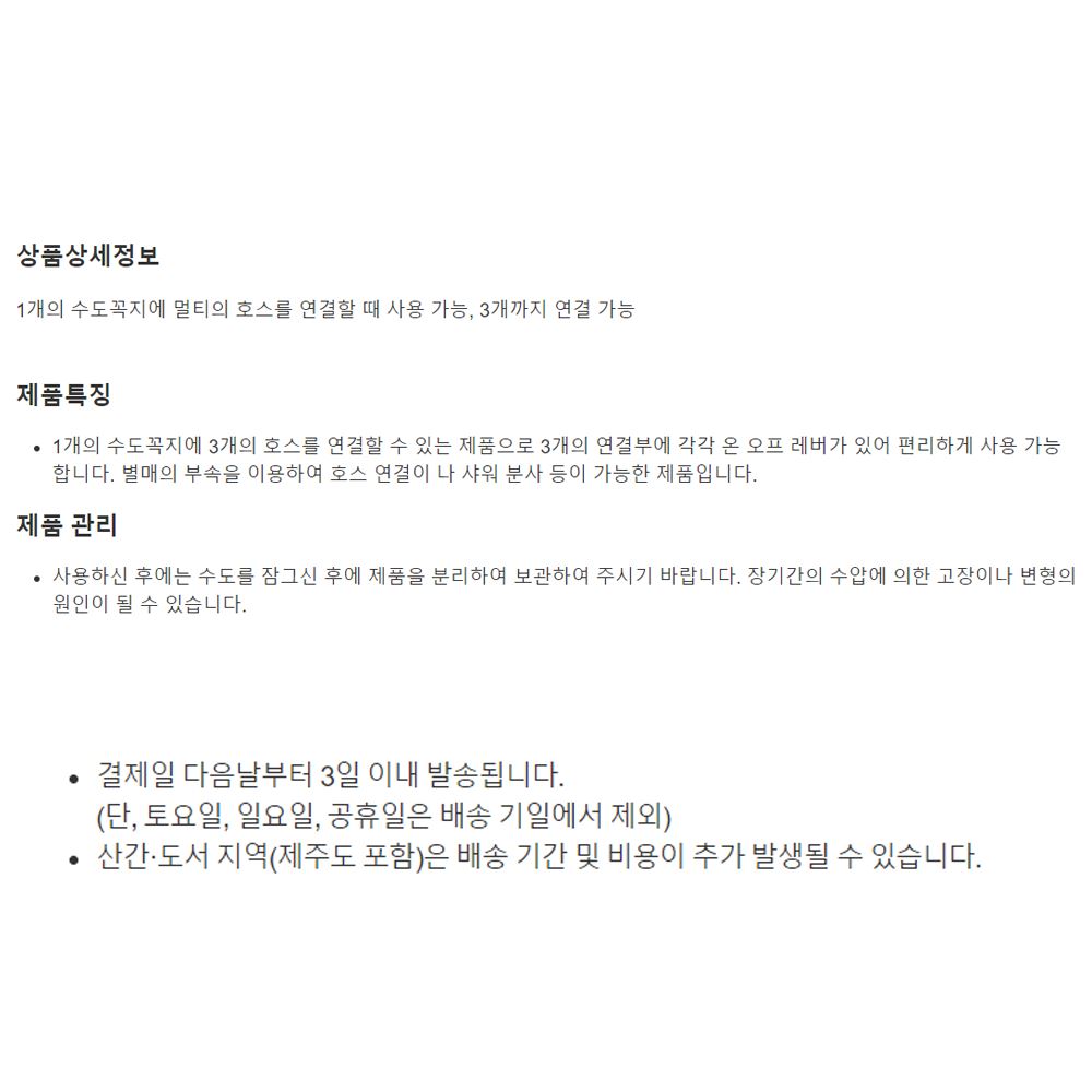 1개의 수도꼭지에 3개의 호스를 연결할 수 있는 제품으로 3개의 연결부에 각각 온 오프 레버가 있어 편리하게 사용 가능합니다.