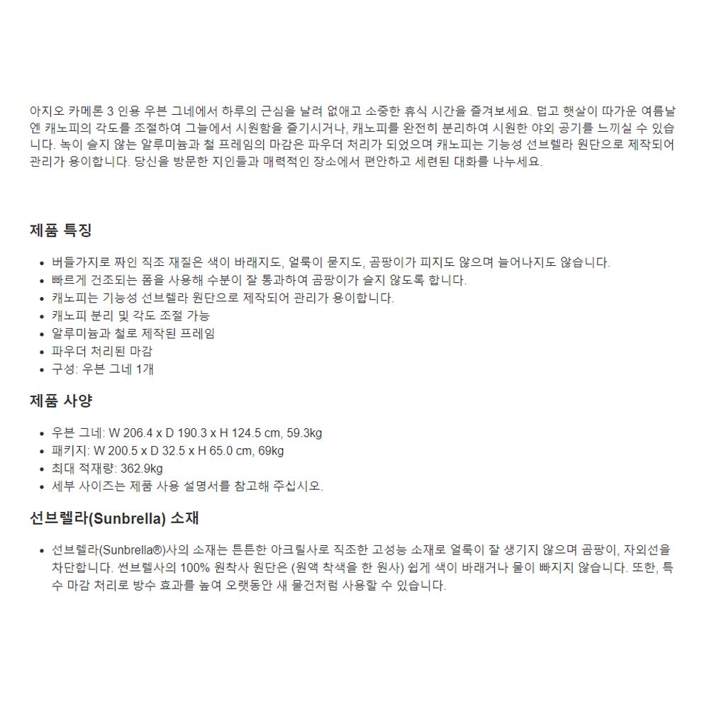 녹이 슬지 않는 알루미늄과 철 프레임의 마감은 파우더 처리가 되었으며 캐노피는 기능성 선브렐라 원단으로 제작되어 관리가 용이합니다.