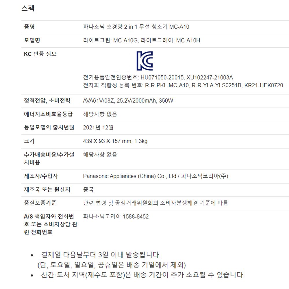 • 파나소닉 2in1 무선청소기 원룸 흡입 물걸레 가벼운 핸디스틱 가정용 초경량 진공 청소기 MC-A10