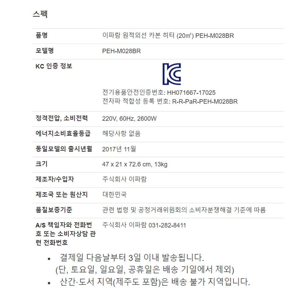 • 이파람 전기히터 카본 중대형 가정용 사무실 업소용 원적외선히터 난방기구 스토브난로 18㎡ PEH-M028BR