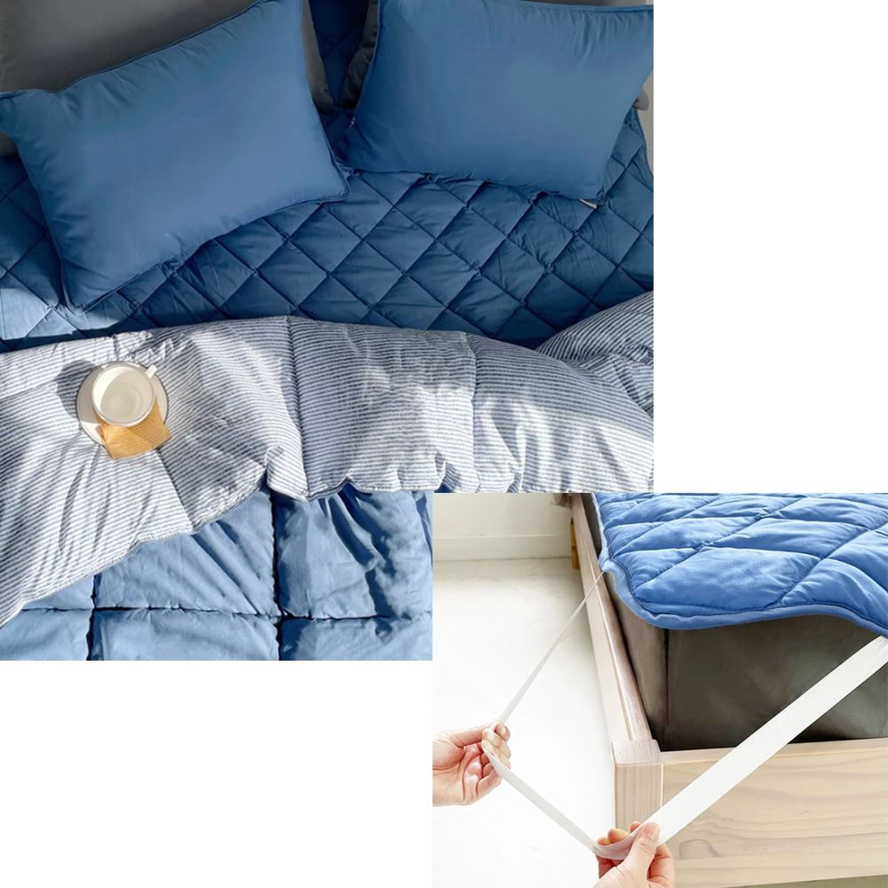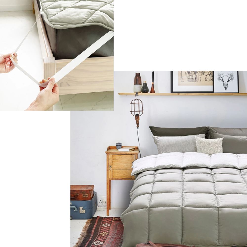 도톰한 패드는 네 모서리의 밴드로 침대 매트리스에 고정하여 사용할 수 있습니다.