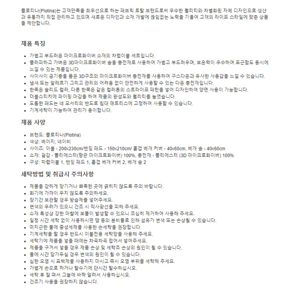 소재: 겉감 - 폴리에스터(항균 마이크로화이버) 100%, 충전재 - 폴리에스터 (3D 마이크로화이버) 100%