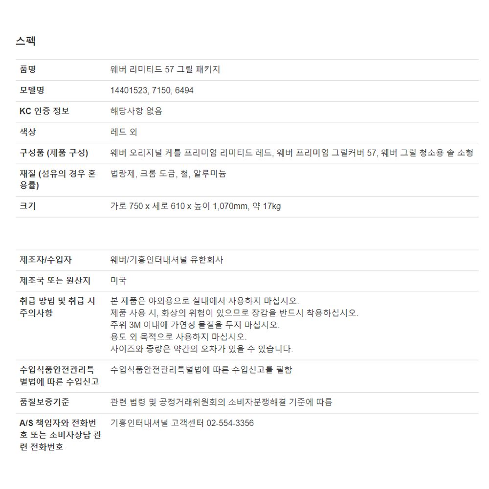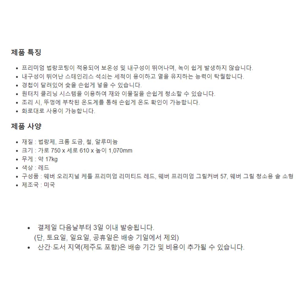 구성품 : 웨버 오리지널 케틀 프리미엄 리미티드 레드, 웨버 프리미엄 그릴커버 57, 웨버 그릴 청소용 솔 소형