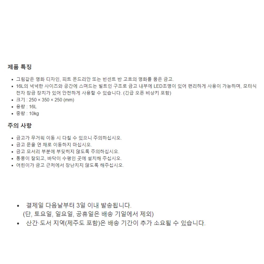 16L의 넉넉한 사이즈와 공간에 스며드는 빌트인 구조로 금고 내부에 LED조명이 있어 편리하게 사용이 가능하며, 모터식 전자 잠금 장치가 있어 안전하게 사용할 수 있습니다. (긴급 오픈 비상키 포함)