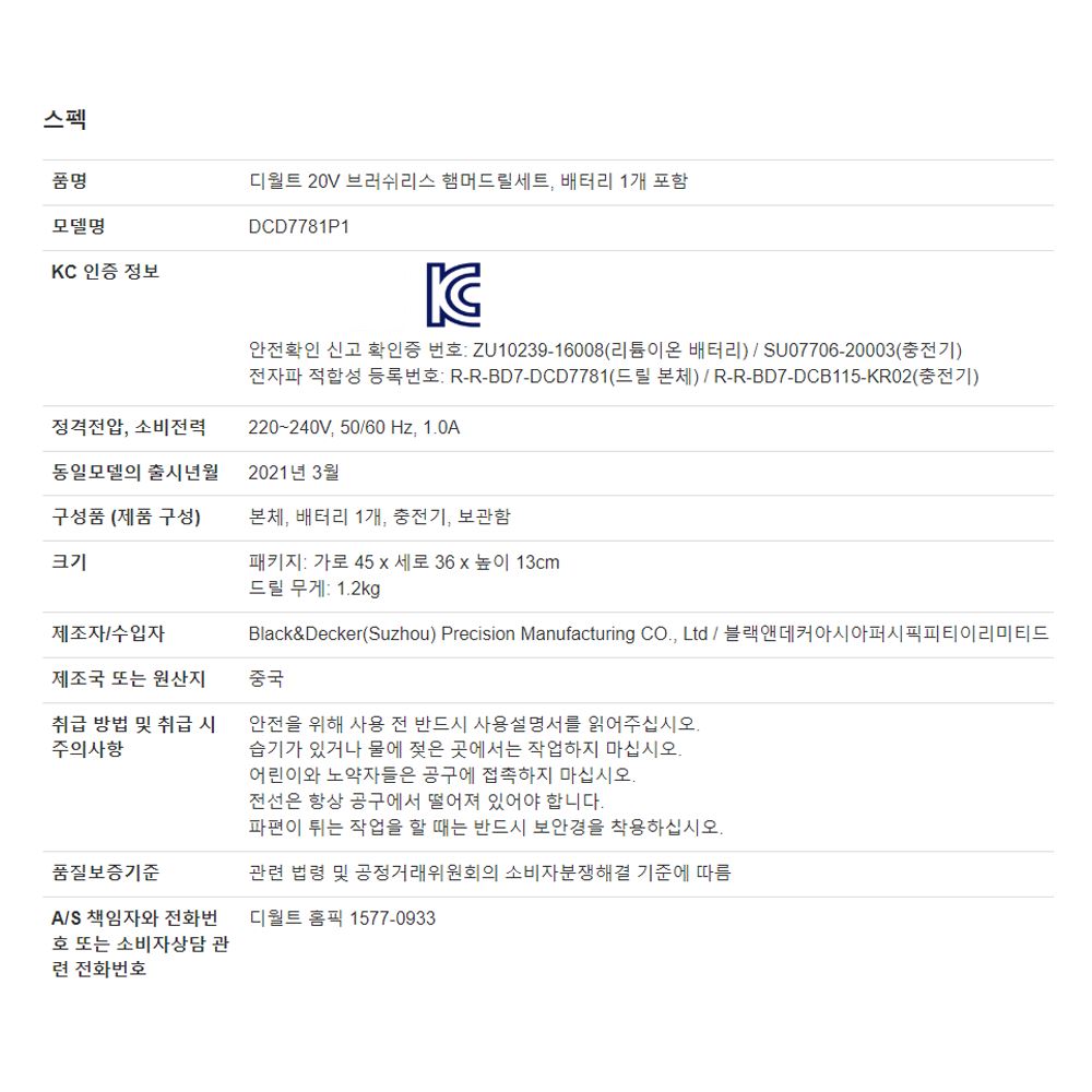 전자파 적합성 등록번호: R-R-BD7-DCD7781(드릴 본체) / R-R-BD7-DCB115-KR02(충전기)