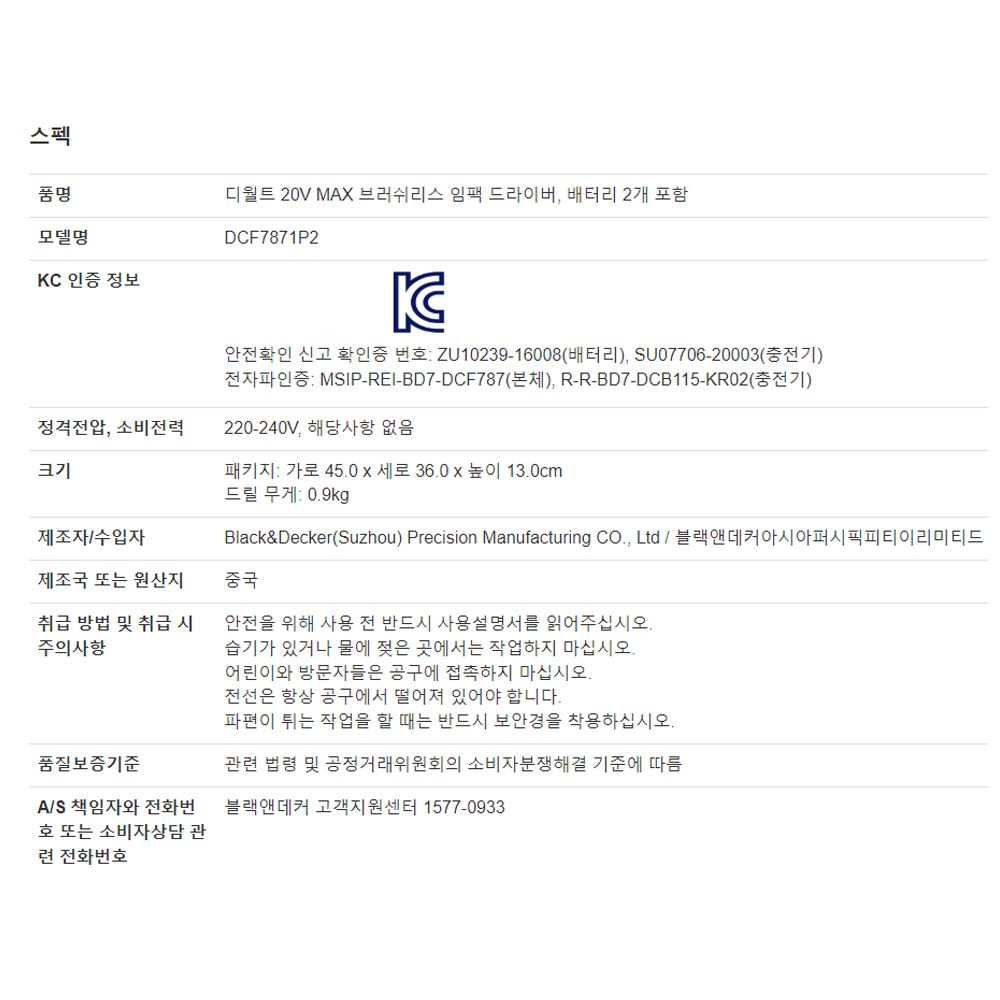 전자파인증: MSIP-REI-BD7-DCF787(본체), R-R-BD7-DCB115-KR02(충전기)