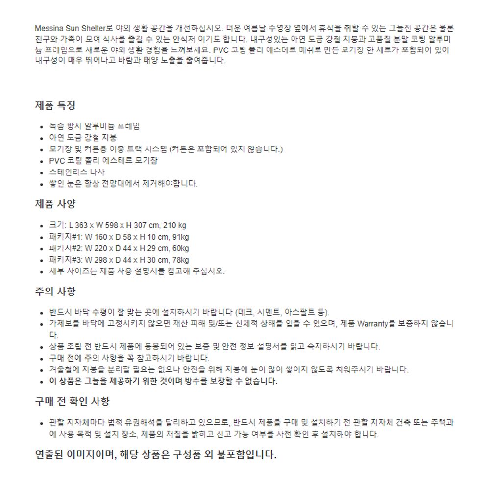 자연재해로 인한 파손은 제품 하자로 규명하기 어려우며, 상품 교환/부품 지원이 불가합니다. 이 상품은 그늘을 제공하기 위한 것이며 방수를 보장할 수 없습니다.