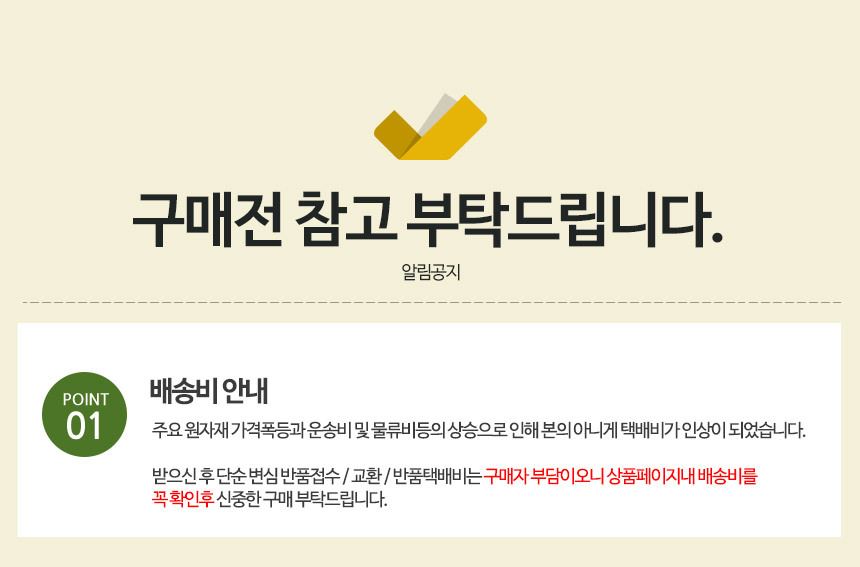 ㆍ 판매자가 반품상품 확인 후 상품불량이 아닌 것으로 판명 시 반송비(또는 왕복배송비)를 고객님께 부과할 수 있습니다.