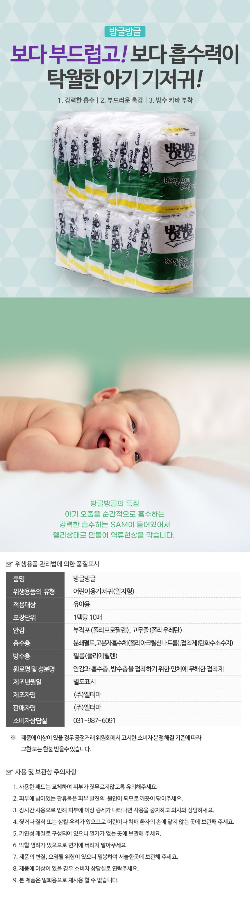 • 방글방글 일자형 일회용 아기 기저귀 10팩 100매