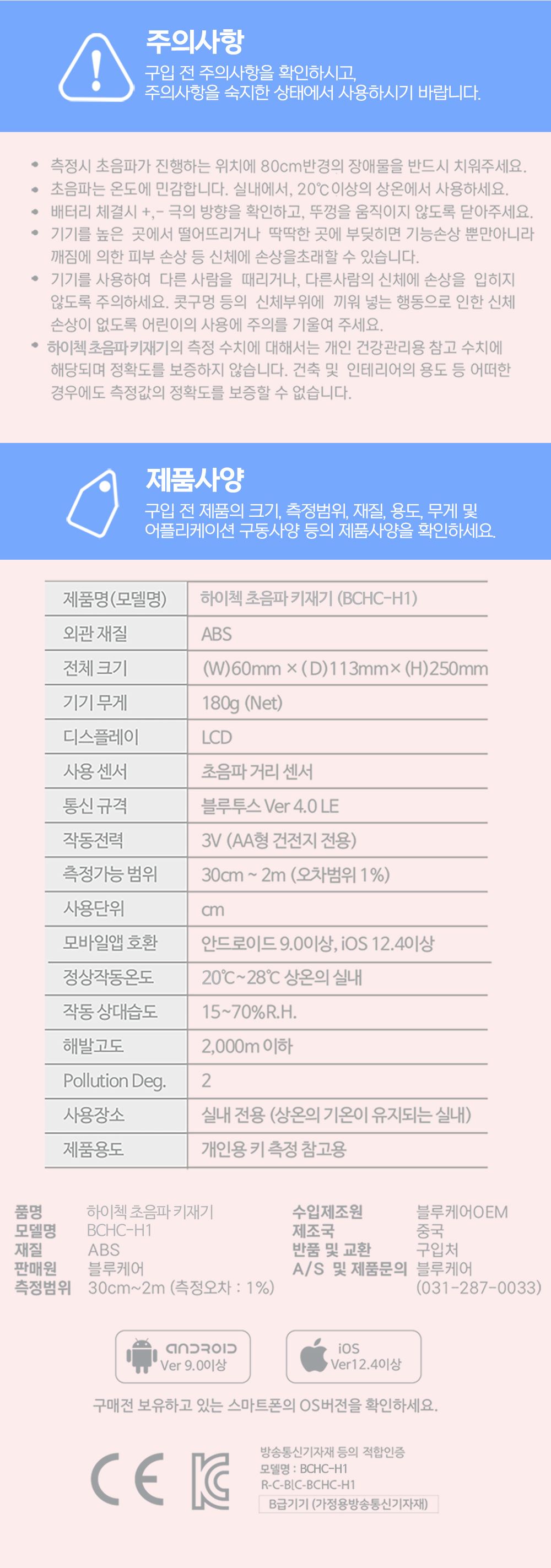 블루케어 블루투스 하이첵 초음파 아이 키재기 BCHC-H1 신장계 블루케어패밀리어플증정