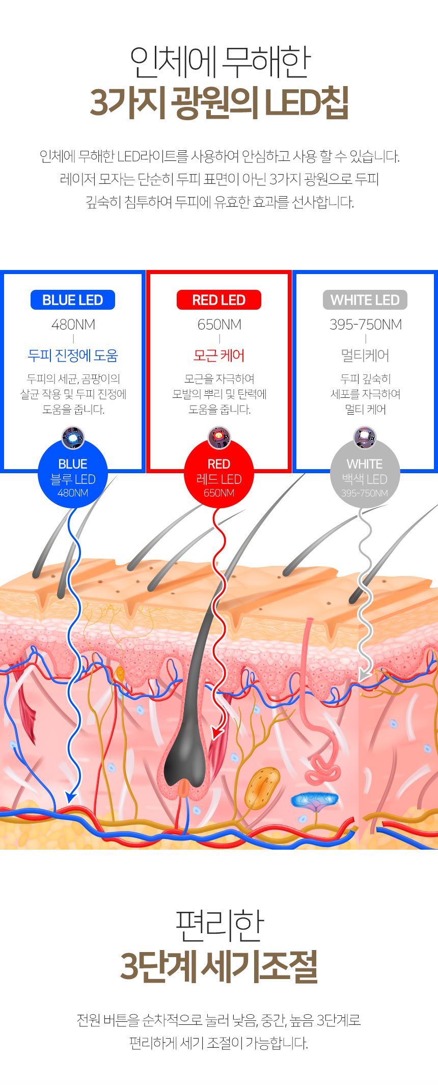 | 주요 사양 | 사용시간(3종) : 각각 30-45-60분 / 적색광파장 : 650NM / 청색광파장 : 480NM / 적외선파장 : 850NM / 백색광파장 : R1~R15>90 395~750NM / 전파인증 : R-R-Seb-SH-LC3 / Adapter KC 인증 : R-R-uaA-DGI 0501000EU / LED 인증 : KILT2210U09435 |