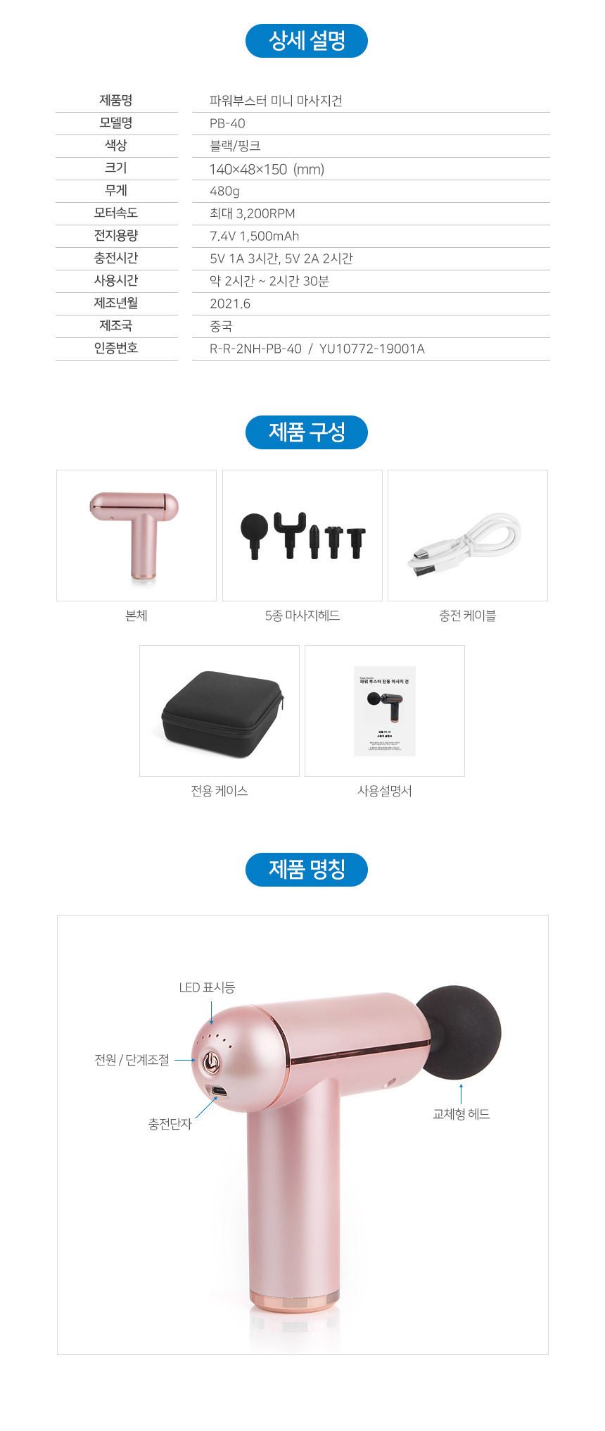 품명 및 모델명 소형마사지건, PB-40