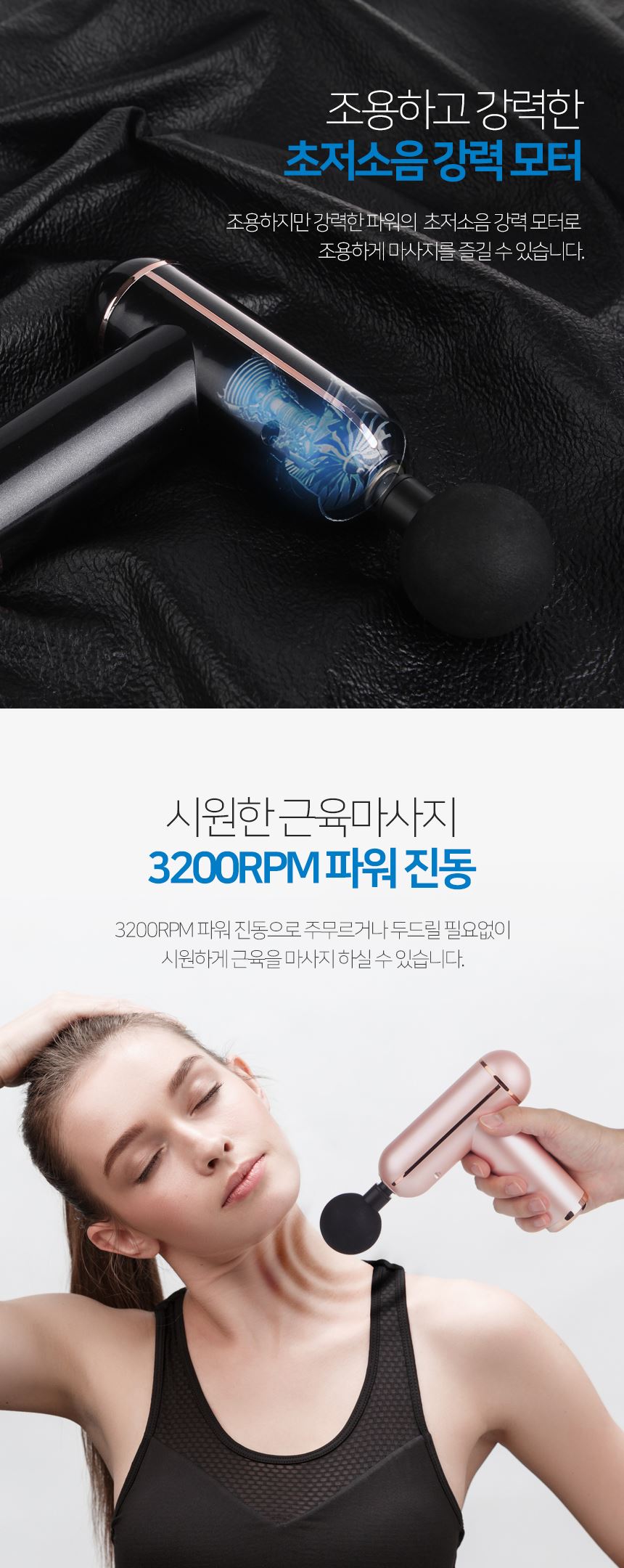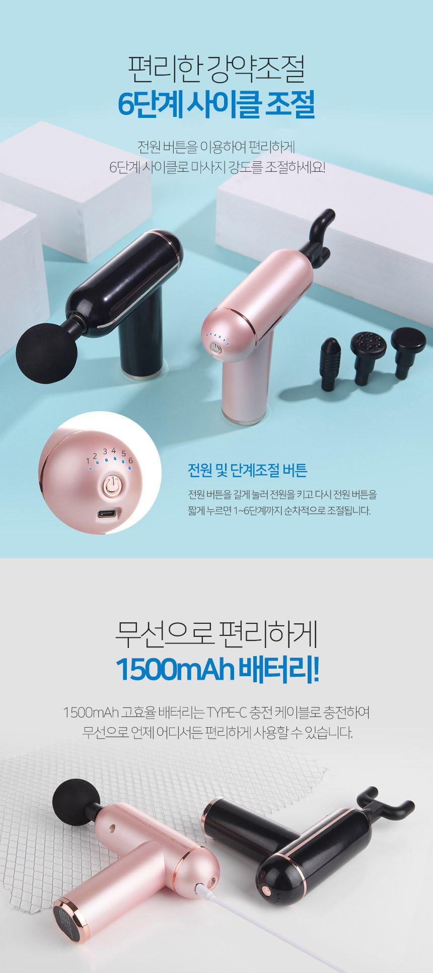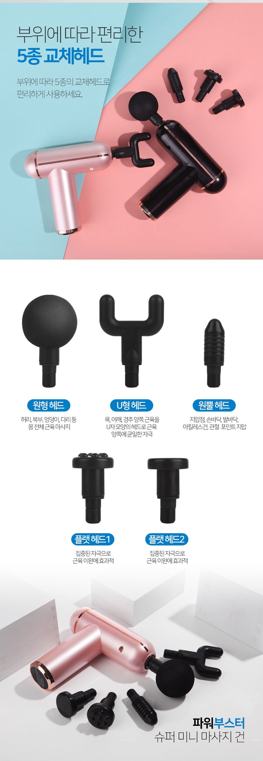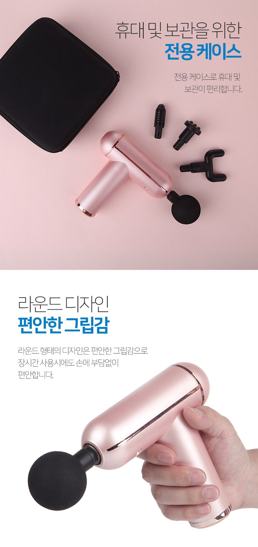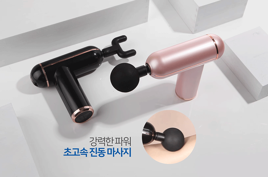 주요 사양 마사지건 / 무선 / 사용시간: 2시간30분 / 강도조절 : 6단계 / 진동횟수 : 3200회(분당) / 교체용헤드 : 5종 / 무게 : 480g / 색상: 블랙, 핑크